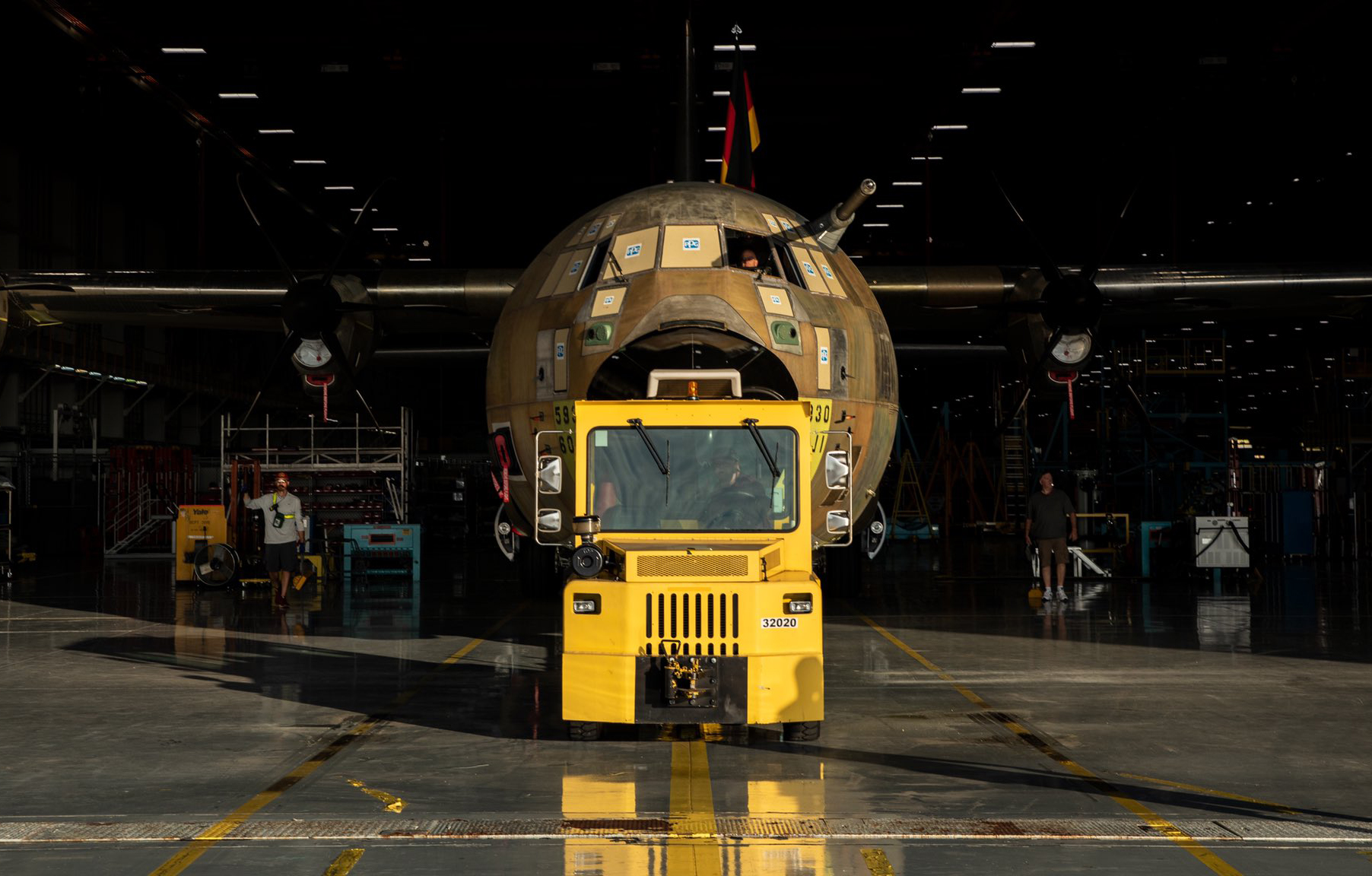 Noch ist sie ganz nackt und unbefleckt. Nur die aufgesprühte Seriennummer 5930 und eine auf dem Dach gehisste Deutschlandflagge verraten die frisch gebaute Hercules als das was sie ist: die erste ihrer Art, die ihren Dienst bei der deutschen Luftwaffe antreten wird.