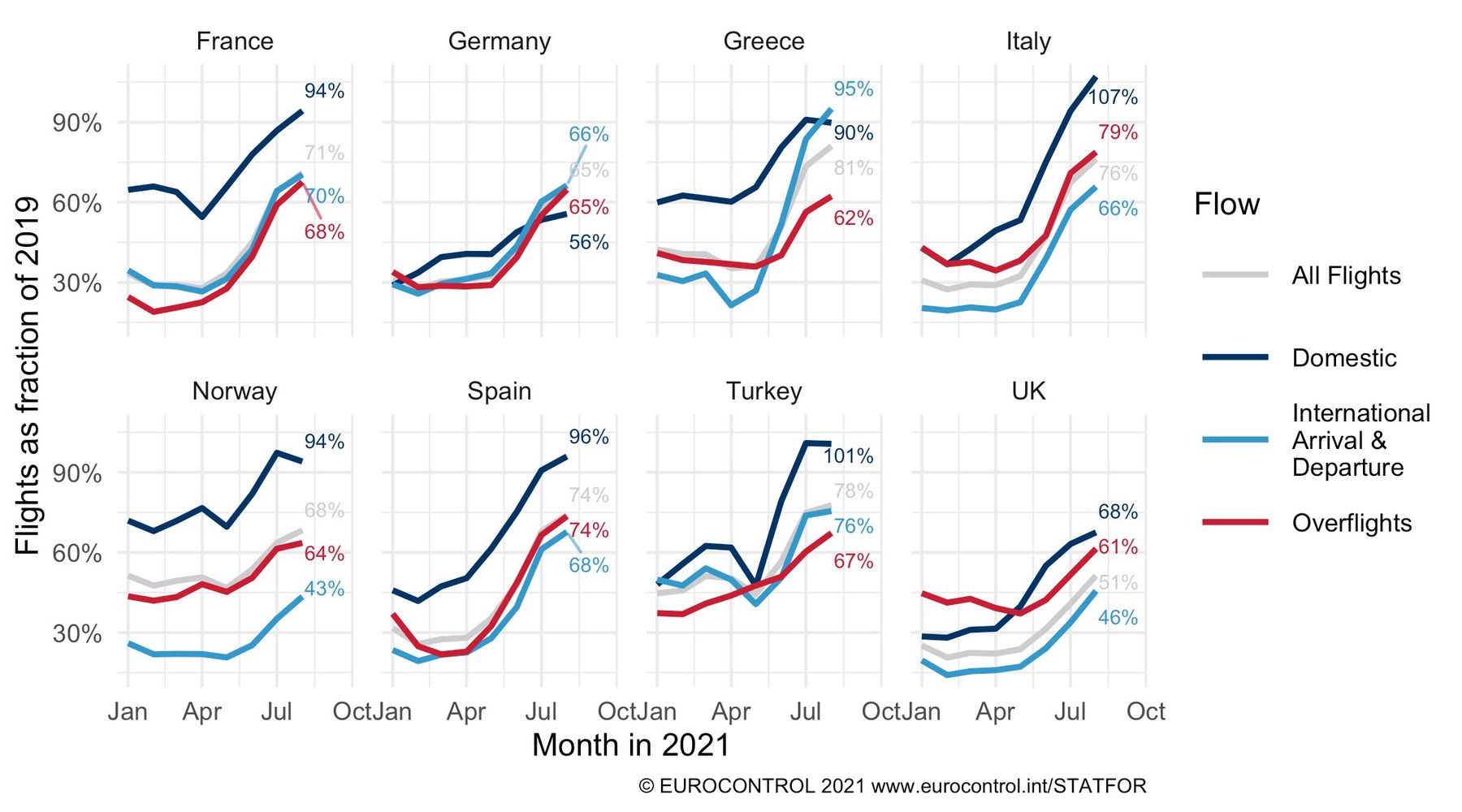 Besonders auffällig ist die Entwicklung bei den Inlandsflügen, deren Zahl in der Türkei und Italien bereits wieder das Vorkrisen-Niveau aus dem August 2019 überschritten hat.
