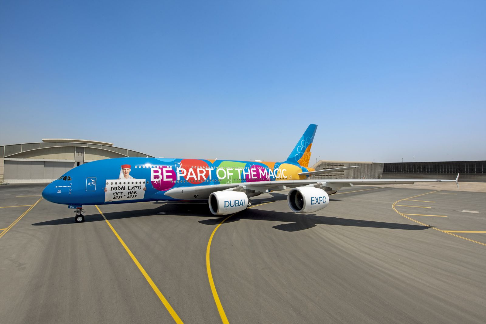 Wer Glück hat, erwischt bei der Anreise nach Dubai einer der offiziellen Expo-Botschafter von Emirates: die Airline hat die A380 A6-EEU mit einem ziemlich auffälligen Sonderanstrich versehen, zwei weitere A380 sollen die Expo-Livery ebenfalls erhalten.
