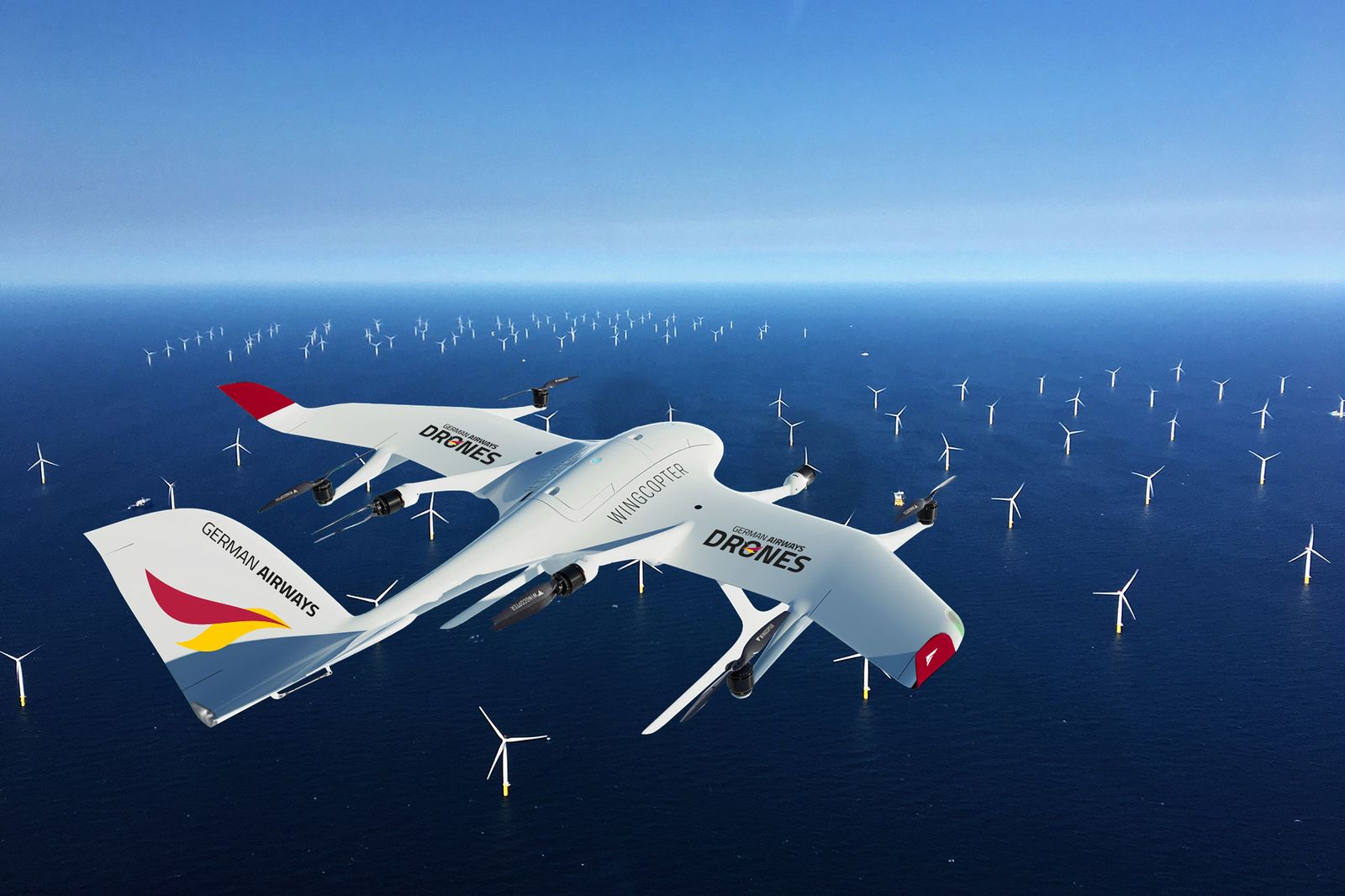 Die von Wingcopter entwickelten Drohnen können mit einer Nutzlast von bis zu fünf Kilogramm beladen werden und schaffen, je nach Zuladung, eine Strecke zwischen 75 und 110 Kilometern. Die Fluggeräte des in Weiterstadt ansässigen Unternehmens wurden von German Airways ausgewählt, weil sie besonders wind- und wetterstabil fliegen können und in Hinsicht auf das Verhältnis von Zuladung und Reichweite weltweit führend sind.