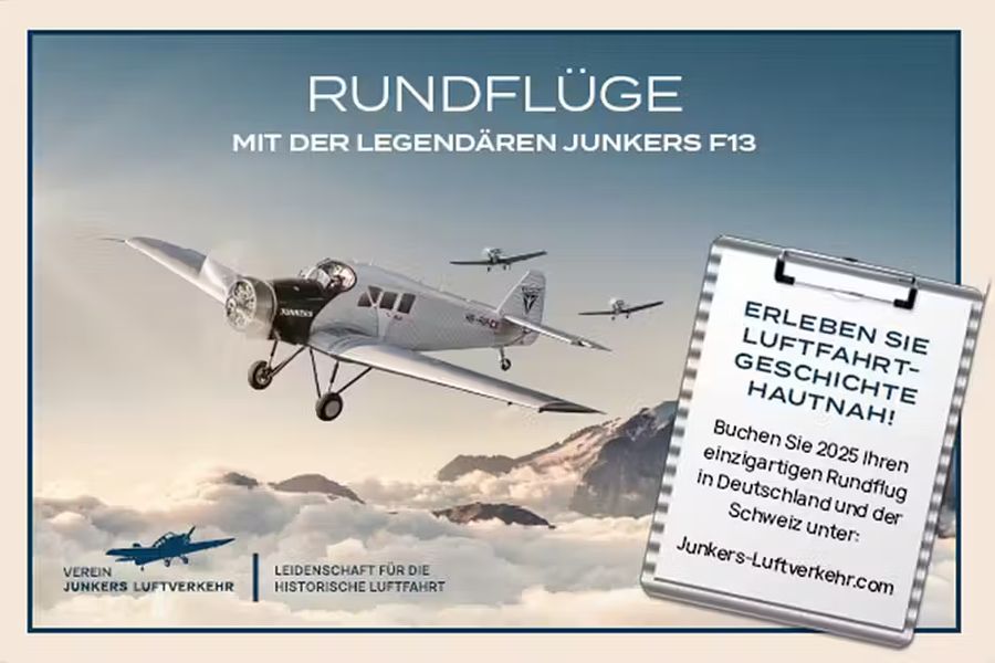Der "Verein Junkers Luftverkehr" (VJL) führt im Jahr 2025 von mehreren Flugplätzen in Deutschland und der Schweiz mehrere Passagierflüge im historischen Ambiente durch.
