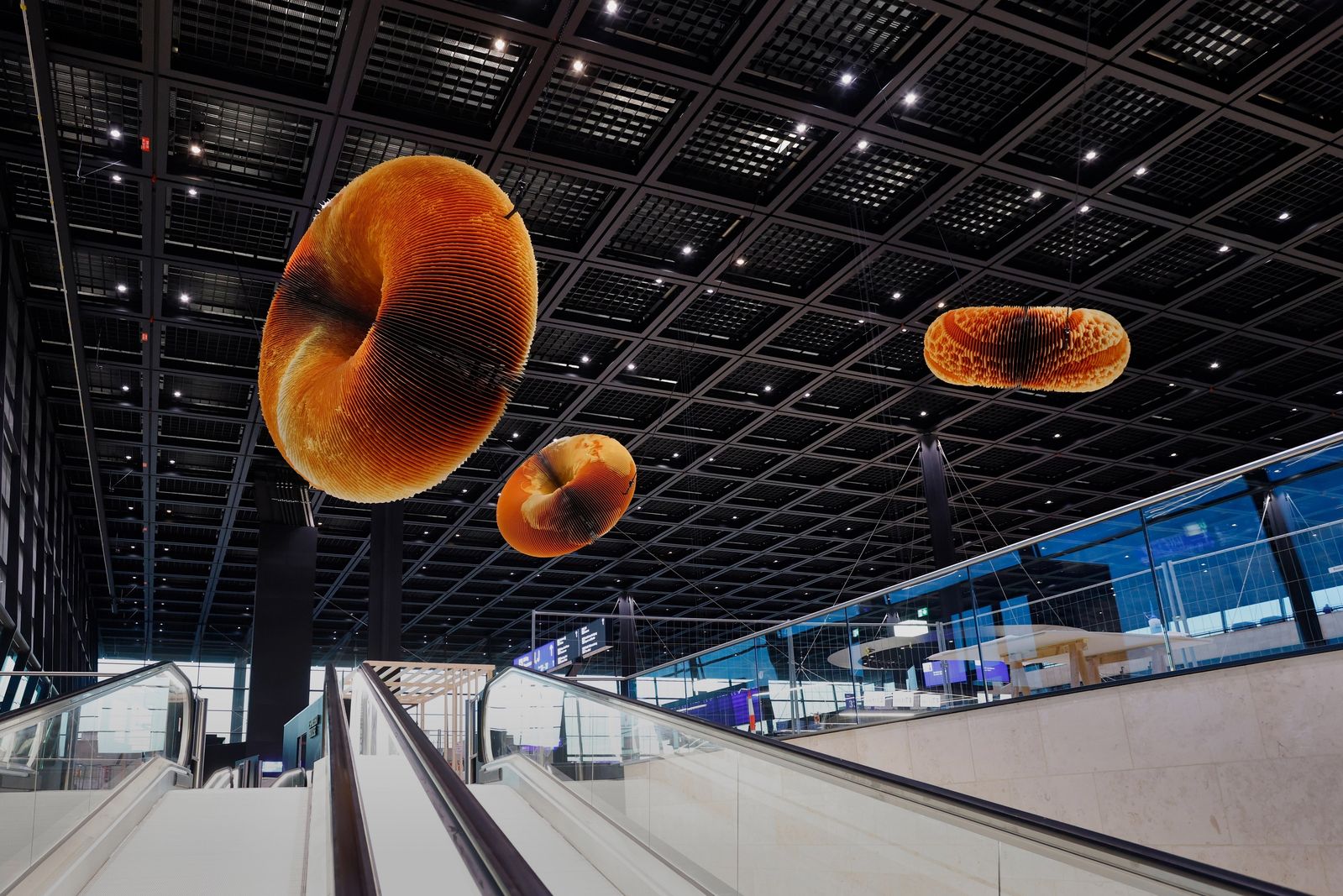 Kunst am Check-In: Passagiere und Kunstinteressierte können im Frankfurter Flughafen künftig eine imposante Installation betrachten. Die tonnenschwere Arbeit des Berliner Künstlers Julius von Bismarck schwebt scheinbar unter der 18 Meter hohen Decke der Check-in-Halle im neuen Terminal 3 und trägt den Titel "The First, the Last, Eternity".