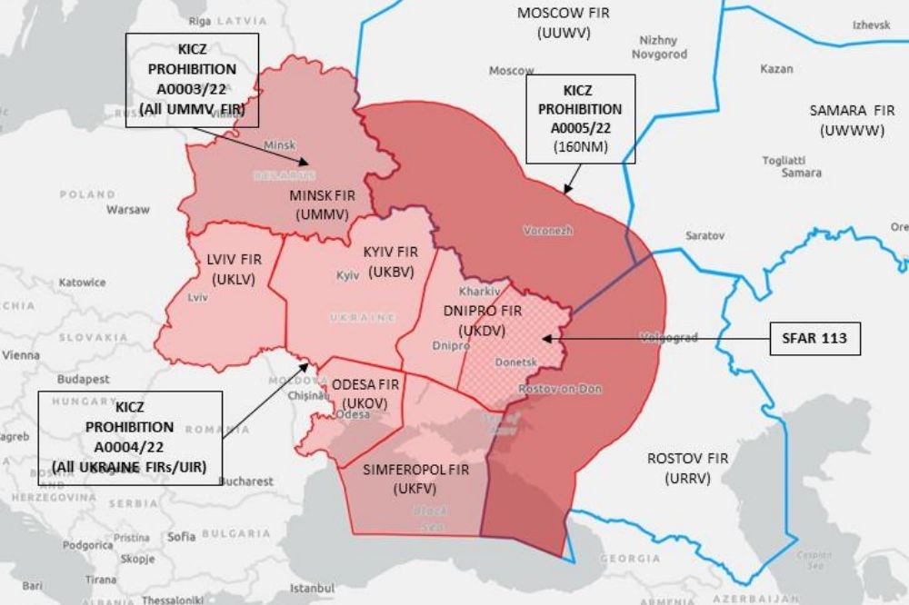 Angesichts der andauernden russischen Aggression führt die EASA auch die gesamte Ukraine weiter als Konfliktgebiet mit strikter No-Fly-Empfehlung.